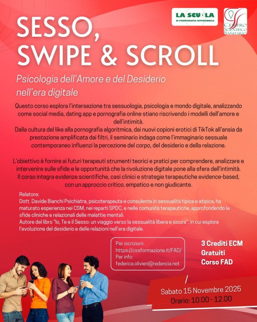Questo seminario favorisce una comprensione aggiornata e multidimensionale delle nuove dinamiche sessuali e relazionali nell’era digitale; promuovere un approccio clinico integrato, critico e culturalmente sensibile; rafforza la capacità dei professionisti di riconoscere l’impatto della vita online del paziente come elemento rilevante della sua storia psicologica e sessuale; sensibilizza alla costruzione di una sessualità empatica, autentica e libera da stereotipi algoritmici.